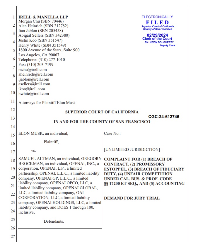 Elon Musk sues OpenAI over alleged breach of nonprofit agreement